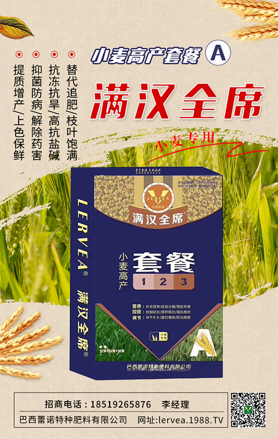 3、抓住小麥返青拔節(jié)的有利時(shí)機(jī),及時(shí)采取促控措施,促進(jìn)弱苗轉(zhuǎn)化,提高成穗率;控制旺長(zhǎng)田塊,預(yù)防后期貪青倒伏。今天,小編為大家?guī)?lái)一款巴西蕾諾特種肥料有限公司的產(chǎn)品--小麥高產(chǎn)套餐A,能夠補(bǔ)充小麥生長(zhǎng)的各種營(yíng)養(yǎng)、調(diào)節(jié)小麥長(zhǎng)勢(shì),提高小麥抗病能力,為小麥高產(chǎn)保駕護(hù)航!