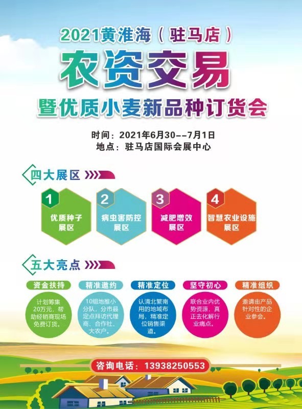 為促進(jìn)我省小麥種子北繁南用,加快我省花生品種推廣、普及高效綠色防控成果,促進(jìn)一二三產(chǎn)業(yè)融合發(fā)展,提升我省農(nóng)業(yè)品牌。2021黃淮海(駐馬店)農(nóng)資交易暨優(yōu)質(zhì)小麥品種展覽會(huì)、2021第二屆河南花生產(chǎn)業(yè)信息交流暨品牌農(nóng)資農(nóng)機(jī)展覽會(huì)將于6月29日到7月1日在駐馬店國(guó)際會(huì)展中心舉辦。